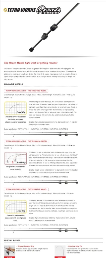 I was surfing the web this evening and ran across this rod. What caught my attention was its weight! It comes in 3 iterations…the React 50 weighs 36 grams!!!! The React 55 weighs 38 grams and the React 65 weighs 44 grams. To me that is incredibly light and it started the gears in my head turning.