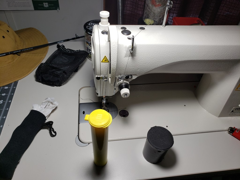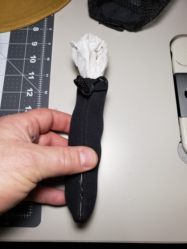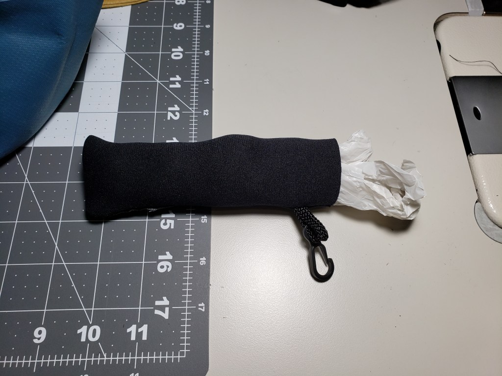 Addendum: a little off-topic but I am always trying to repurpose items and this was no exception. I found an old pair of safety glasses that had a neoprene cover and decided to make that into a super small pouch that holds two Walmart bags for the trash round-ups I always do.