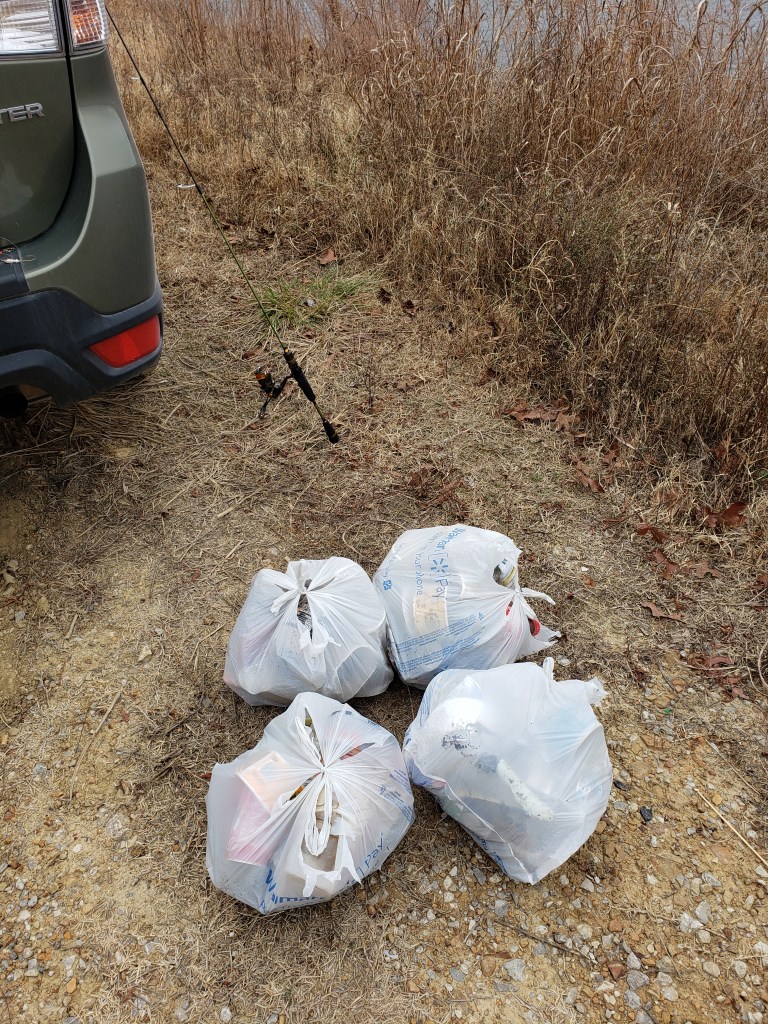 It started sprinkling after I had been fishing for 20 minutes and the wind picked up. Forecasts called for 10-20mph winds with gusts up to 30mph. I decided to pick up trash and wait for the gusts to die down a bit before continuing.
