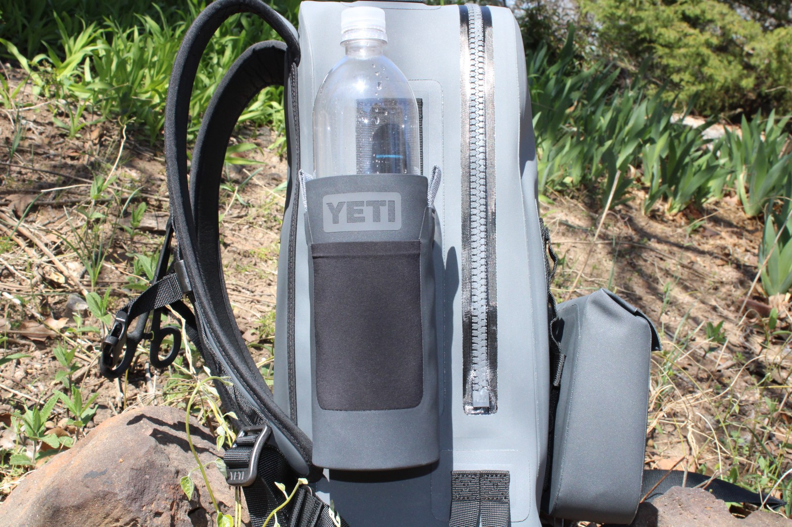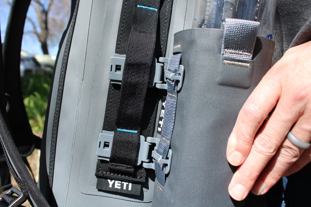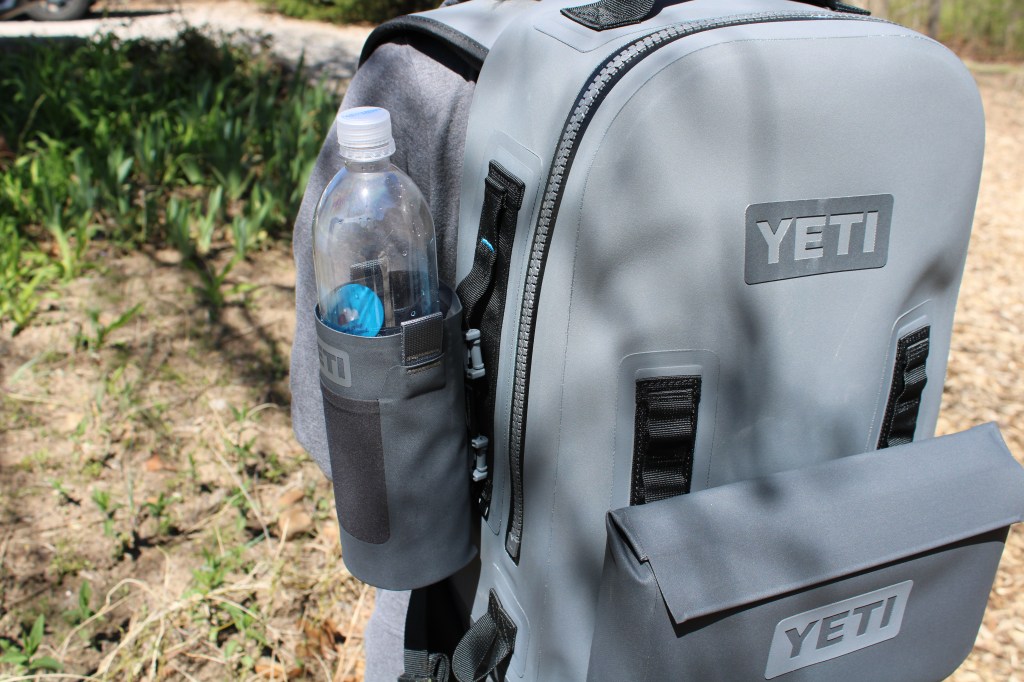 We did manage to find an Okuma 2-piece Medium power rod and as we were walking to the checkout stand…we stopped at the Yeti area to see what was new. I told her that she should get the Yeti Sidekick to go on her Panga 28 since it adds room to hold regular use stuff like soft plastics. She snatched one up. As she was checking it out I noticed something on the bottom shelf of the display and asked her to hand it to me. It turned out to be the Water Bottle Pouch/Sling for their 18oz Rambler. I looked it over and we decided to each get one. We have been trying out various methods to attach a water bottle to the side of the Panga 28 but never really liked any of the options.