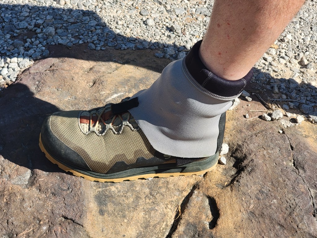 I decided to try the Simms 2.5mm Neoprene Wading Sock coupled with the Simms Gravel Guards that velcro around the boot. This allowed me to set them much lower and also to roll the top of the sock down over the top of the gravel guard. Not perfect, but functional. I still want to play around with this setup to see if I can improve upon it.