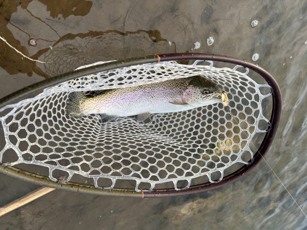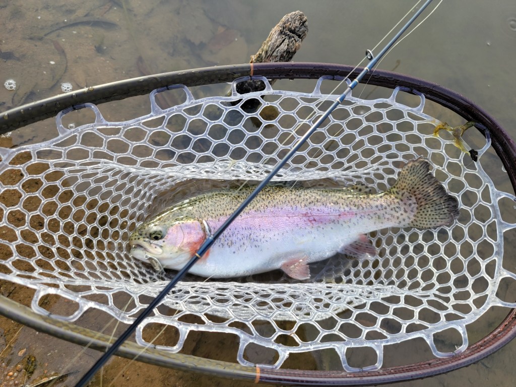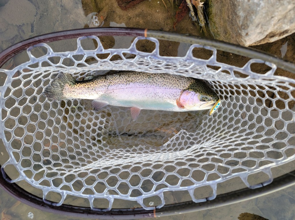 All told we caught 8 trout and that one Largemouth bass, so not a bad day at all. We would’ve had a few more but they came unbuttoned before we could get the net on station to receive them. The bonus was that this trout pond is free to fish as long as you have a State fishing license. We were both using trout spoons and they performed well until the bite switched off.
