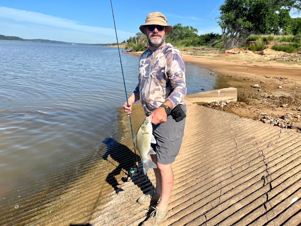 Finally we popped out on a sand point just above the lake and we noticed a concrete structure down further along the shoreline. It turned out to be an old boat ramp that had seen much better times. On a whim, we both started casting out to where we could see Shad jumping and something chasing them.