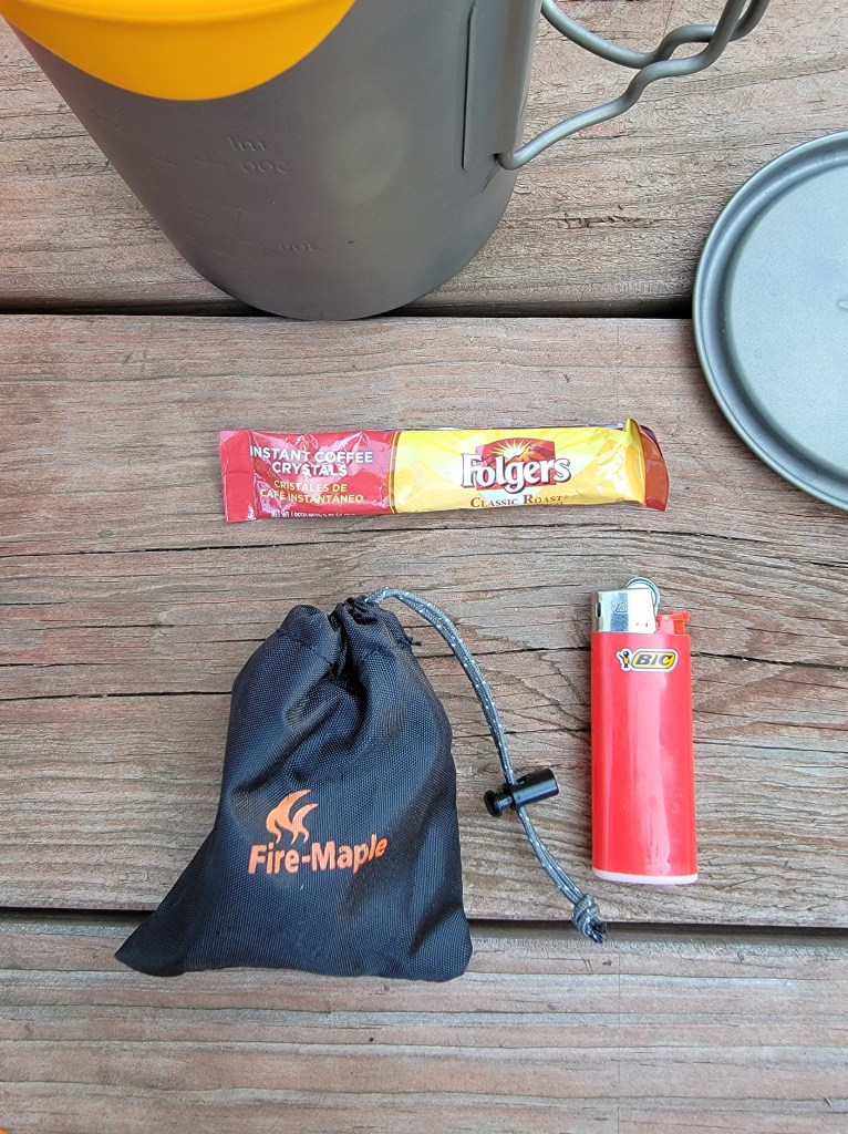 First up is the cook system I carry with me when I am fishing. Everything fits inside a TOAKS Titanium 750ml Mug. The kit includes a 100 gram isobutane canister, a Jet Boil canister stand, a Fire Maple 300T stove, a mini-Bic lighter, some coffee singles and a Snow Peak silicone “Hot Lips” guard. Anytime I feel like having coffee or tea, I pull this out and fix a cup on the stream bank.