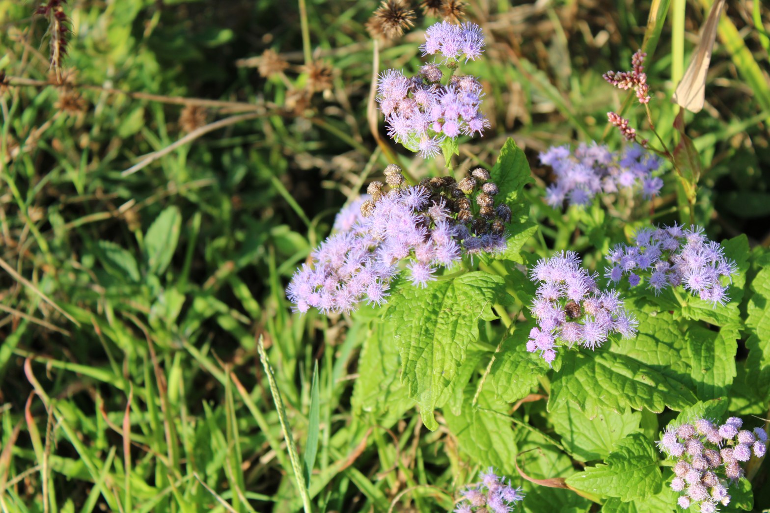 Snakeskin and Lamiaceae.Vibrant reds. Cardinal Flower (Lobelia cardinalis)Brilliant whites and yellows. Prairie Fleabane (Erigeron strigosus) and Sneezeweed (Helenium amarum)Subtle purples. Blue Mistflower (Conoclinium coelestinum) and Lesser Snakeroot (Ageratina aromatica)