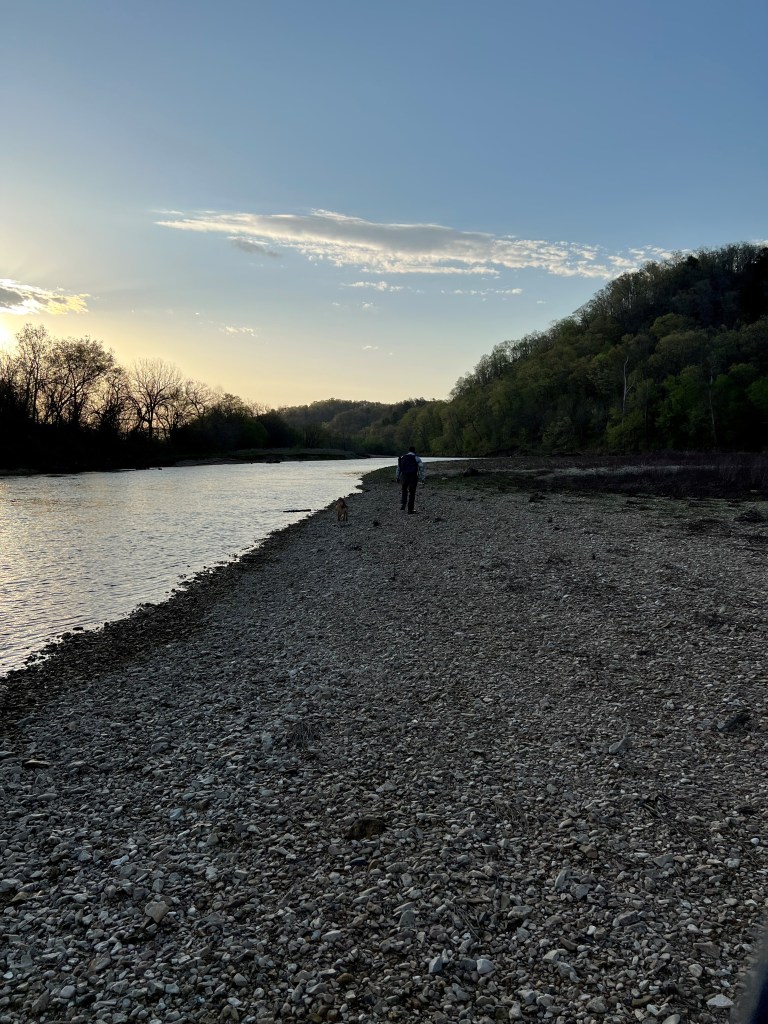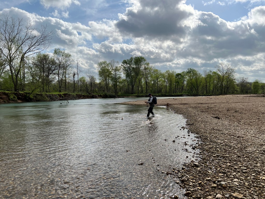 We had a near miss with Zip as he decided to chase after the two geese in the background of the photo above. I called him back and he came running but wasn’t paying attention and fell off the gravel seam into deeper water. He started dog paddling without making progress and he started drifting across into deeper water. I waded in at and the last second (the water depth was quickly approaching the tops of my waders) managed to grab him and drag him back onto the gravel bar. He was much more careful after that.