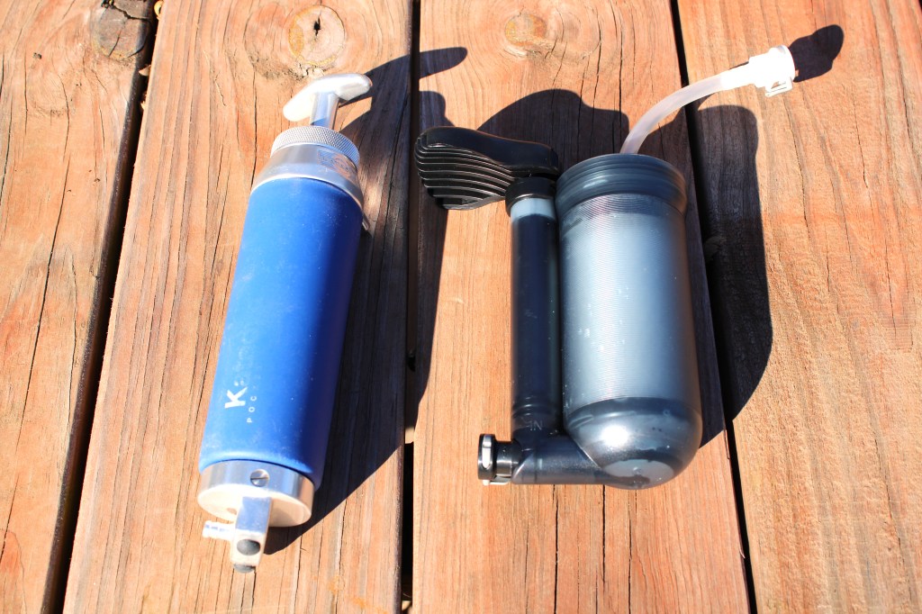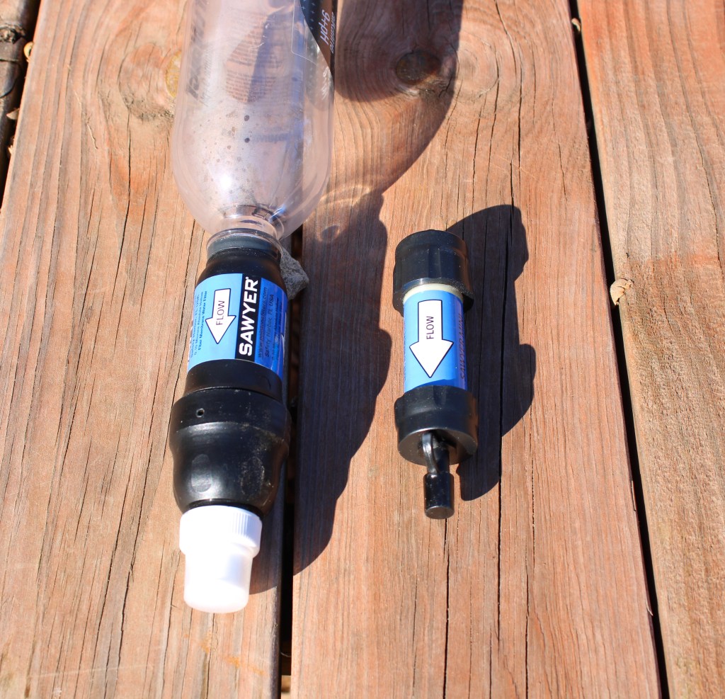 The Sawyer Squeeze and Sawyer Mini filters are compact and screw onto most water bottles. I have used the Squeeze in a homemade gravity filter for large groups. They can be connected to water bladders as well. Some people prefer carrying water bottles but I don’t like toting the extra weight. I tend to reuse plastic water bottles for a long time so one is enough for me. We’ve used the Sawyer filters for years and have never had an issue. And being able to backflush them extends their lifespan.