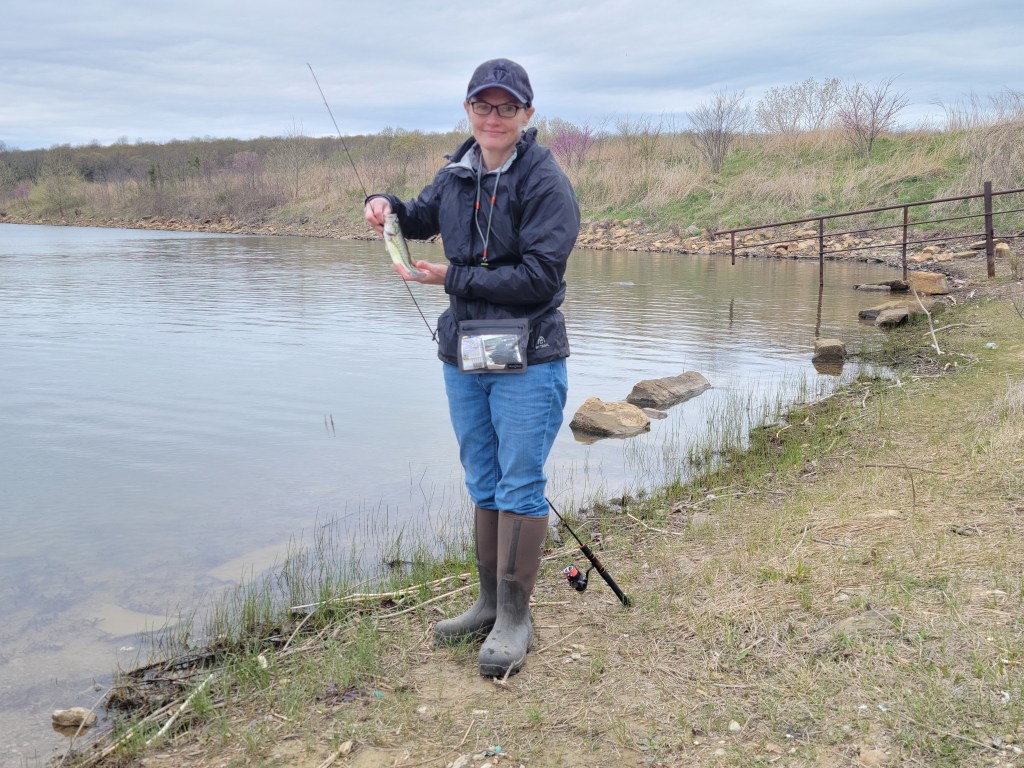 Between gusts of wind and rain showers, we managed to get out and fish for an hour. She caught 2 little largemouth bass and I caught one. And I do mean little. We figured that the front that moved through would push them back into deeper water and we were correct.
