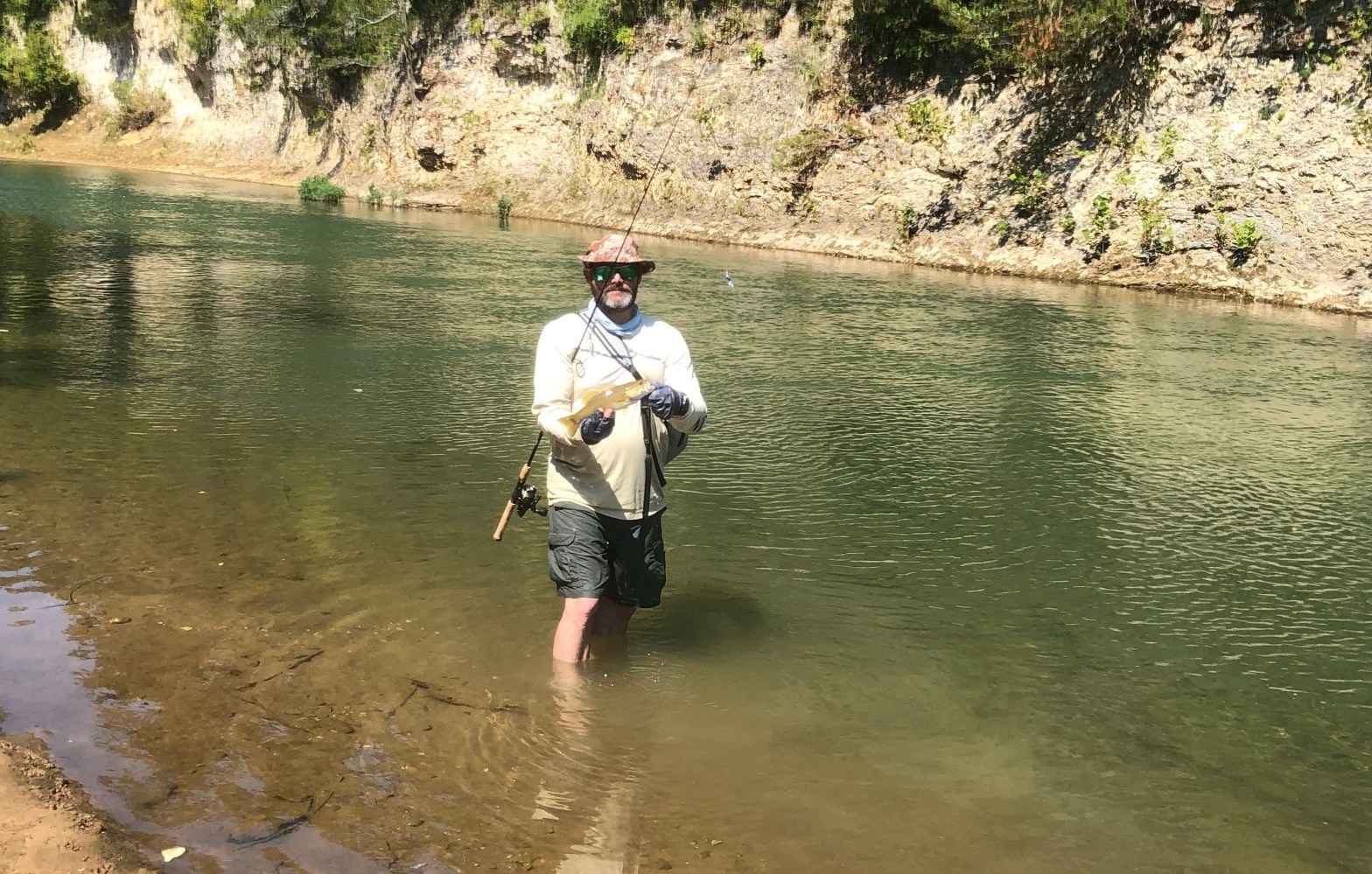 In the background, over her left shoulder, where the water next to the bank is the deepest, is where she caught it.